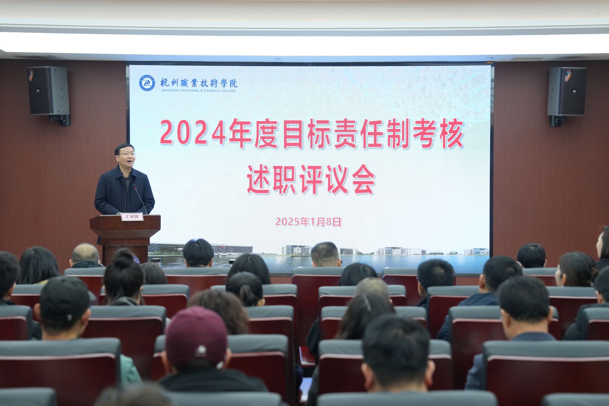 1月8日上午,学校在行政楼117会议室召开2024年度目标责任制考核述职评议会议,校领导班子成员,各教学机构、职能部门主要负责人,教学机构副职领导干部、专业负责人、科级干部以及教师代表参加会议。