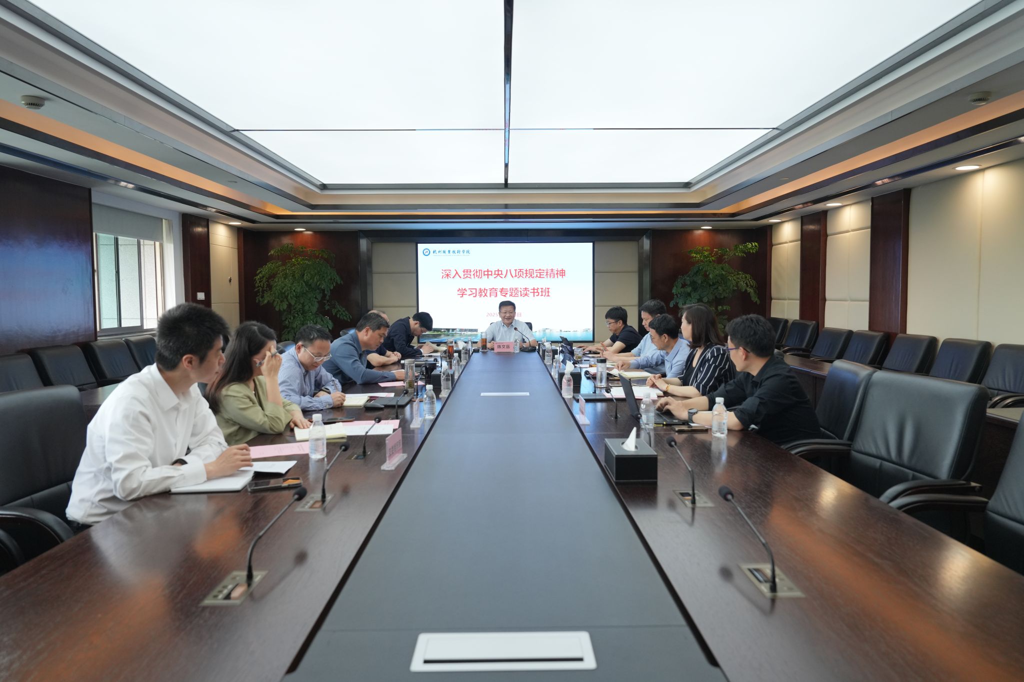 4月24日,学校党委在行政楼528会议室开展深入贯彻中央八项规定精神学习教育专题读书班第二次学习研讨暨党委理论学习中心组学习会。校党委书记陈文岳主持会议并讲话。校党委领导班子成员及办公室、组织部、纪委办负责人参加会议。
