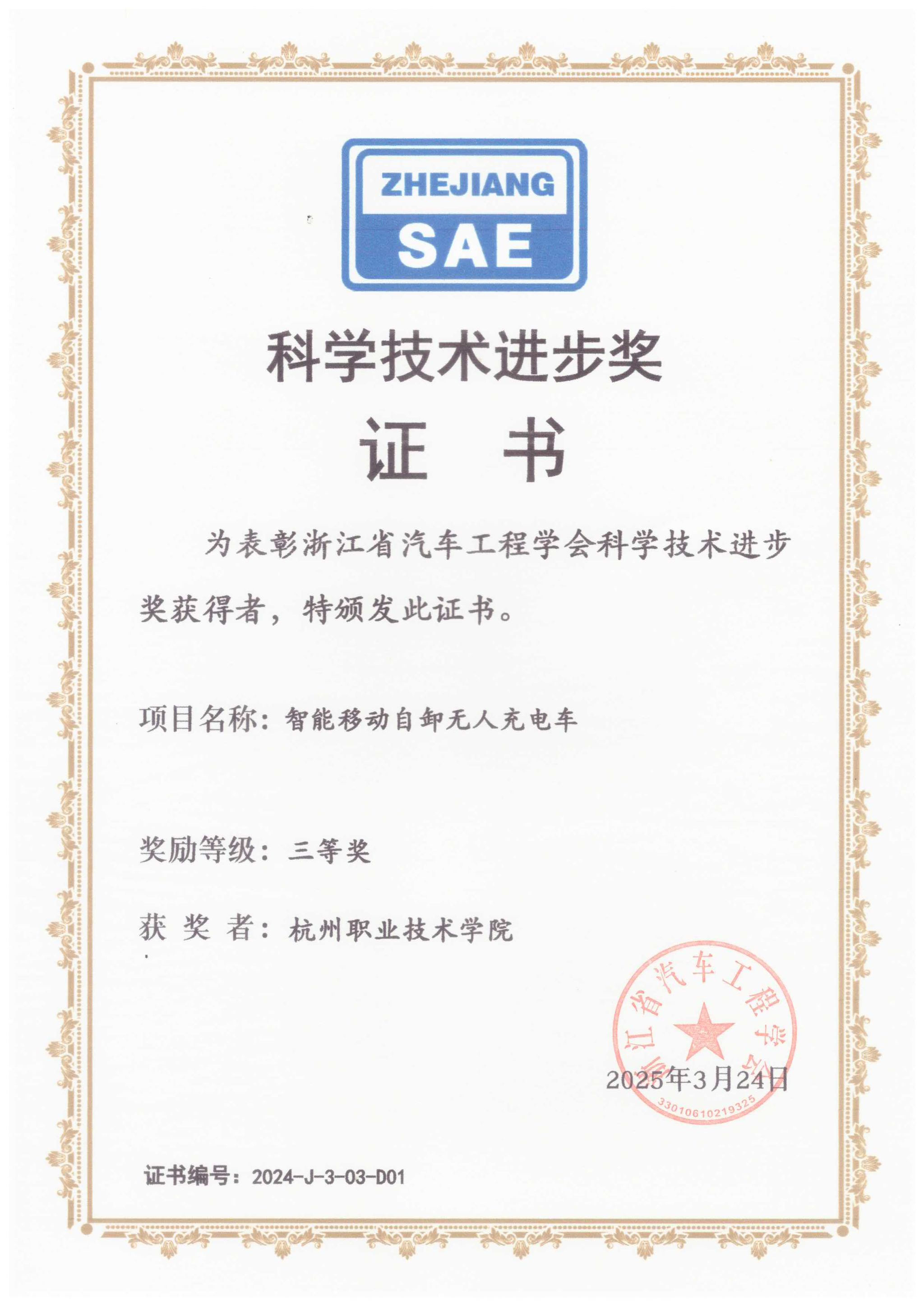 我校获评浙江省汽车工程学会2024年度学会工作先进单位,吉利汽车学院杨爱喜、李兰友两位老师获评2024年度学会工作先进个人。吉利汽车学院杨爱喜教授团队主持的《智能移动自卸无人充电车》项目以我校为第一单位获得浙江省汽车工程学会2024年度科技进步奖三等奖,参与浙江方圆检测集团股份有限公司主持的项目《新能源汽车减速器关键性能检测技术及装备的研究与应用》获得科技进步奖二等奖。
