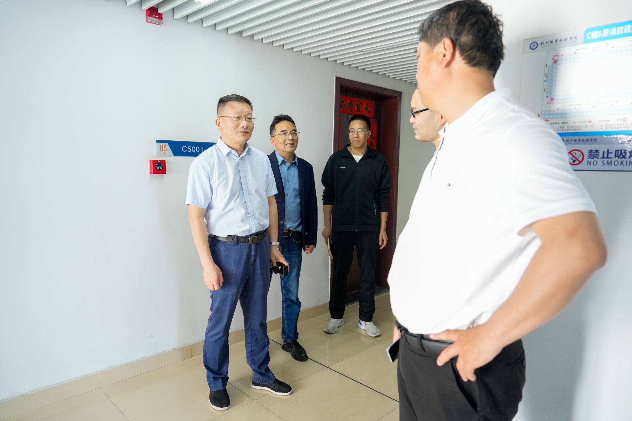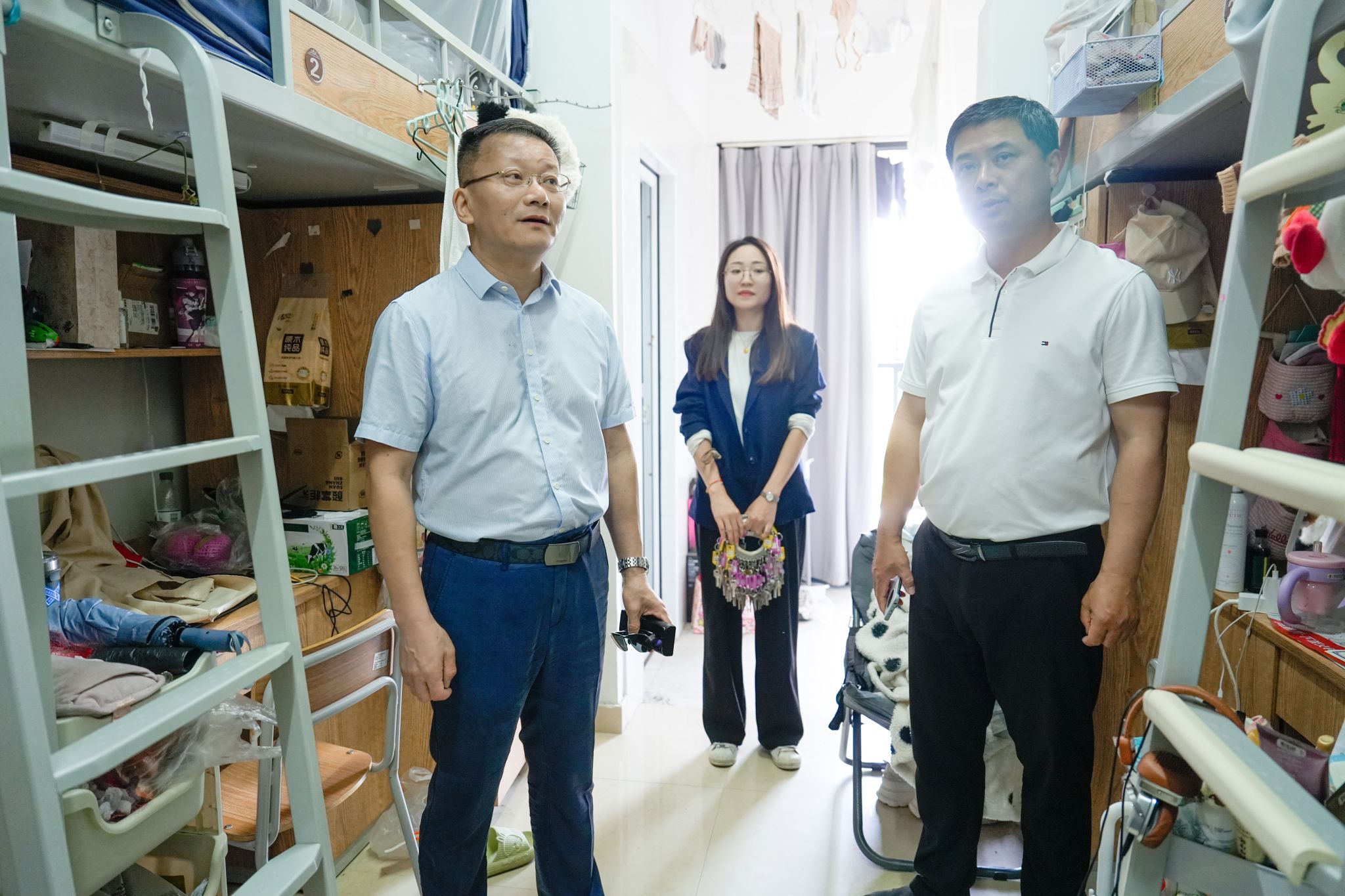 陈文岳一行先后深入校园超市、图书馆、智慧教室等关键场所,实地检查各场所的消防设施完整性、电气线路安全性,并详细了解安全管理制度落实情况和日常安全巡查工作开展情况。针对检查中发现的安全隐患问题,他要求立行立改。在学生公寓,陈文岳一行随机走访多间宿舍,重点检查宿舍卫生环境、用电安全等情况,详细询问了同学们的日常生活需求,认真倾听了同学们关于宿舍基础设施、热水供应等方面的意见建议,他叮嘱同学们要进一步增强安全防范意识,养成良好的生活习惯,共同维护宿舍安全。
