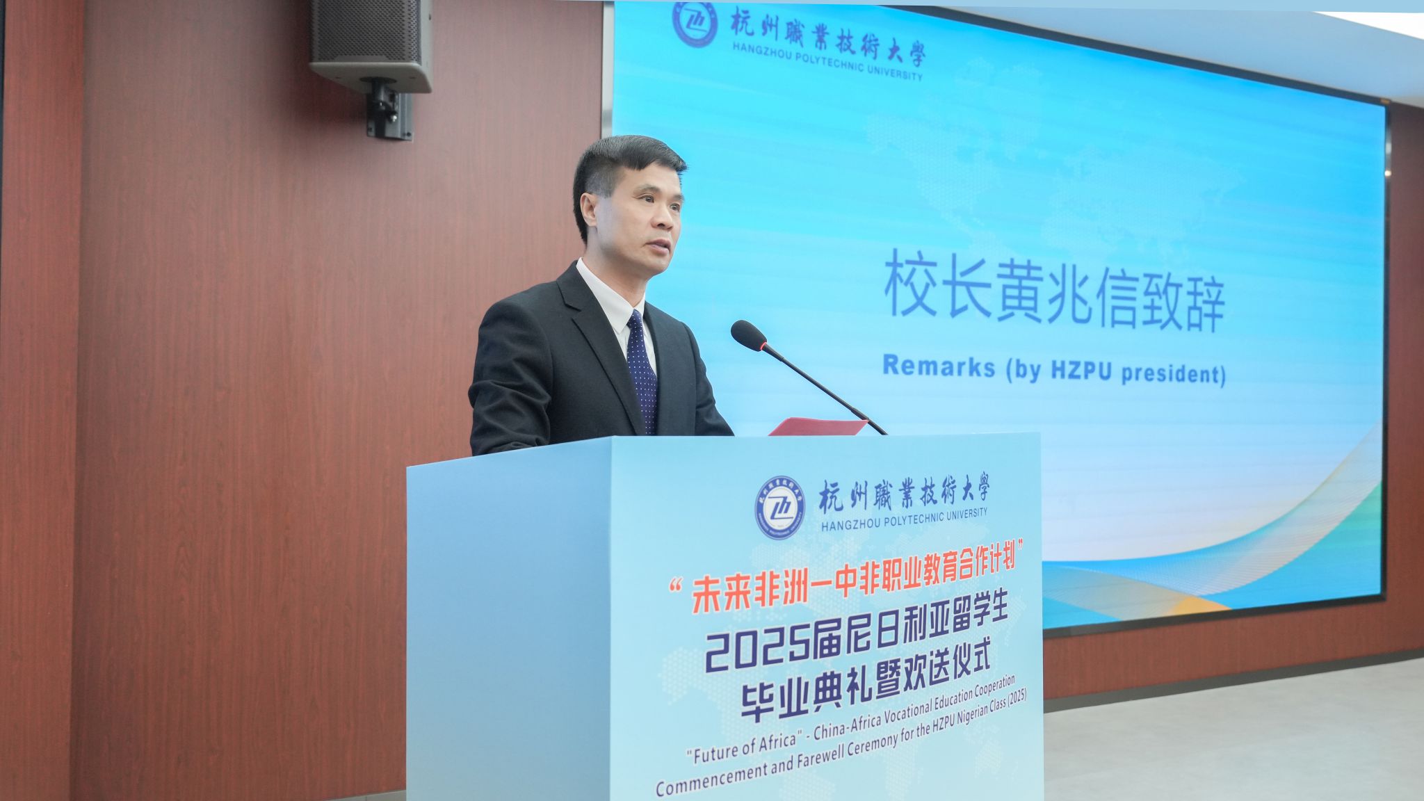 黄兆信在毕业典礼致辞中向25名尼日利亚留学生顺利毕业表示热烈祝贺,并为全体留学生颁发了毕业证书。他指出,留学生们跨越山海来到杭州,在知识学习、技能竞赛和文化交流活动中表现突出,取得了一系列优异成绩,用实际行动践行了“求索”与“奋斗”的精神。面对即将开启新旅程的留学生,黄兆信提出了三点期望:一是要秉持“苟日新,日日新,又日新”的革新精神,坚持不懈深学知识、精技强能,勇于创新,努力成为推动地方经济社会发展的先锋力量。二是要胸怀“海内存知己,天涯若比邻”的广博情谊,坚持不懈深耕知行合一的理念,以实际行动促进中非文化交流,努力成为中尼文化交流的“连心桥”;三是要恪守“先天下之忧而忧,后天下之乐而乐”的胸怀格局,坚持不懈学习中国文化,熟悉中国历史,在中尼友好合作与发展的实践中,努力守护中非文明交流互鉴成果。