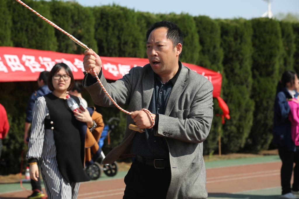在每个人的记忆中,都少不了儿时和小伙伴们一起跳绳的回忆。本届运动会特别设置了双人跳绳和跳长绳两个项目,让教职工们重温儿时的记忆,增强团队协助能力。看,那两位老师配合得多么协调!腾起、落下,两人步调一致,男老师利落的短发微微摆动,女老师长长的马尾扬得老高,男老师手里的绳子甩得呼呼作响。真是“绳”采飞扬。跳长绳是每年的保留项目,两位教师使劲地摇着长绳,运动员们挥动双手,踩着精准的节奏跑到长绳中间,躬身跳跃,听着跳绳一次次抽打地面的啪啪声,看着教师们灵活的身姿,真有重回青葱岁月的感觉。